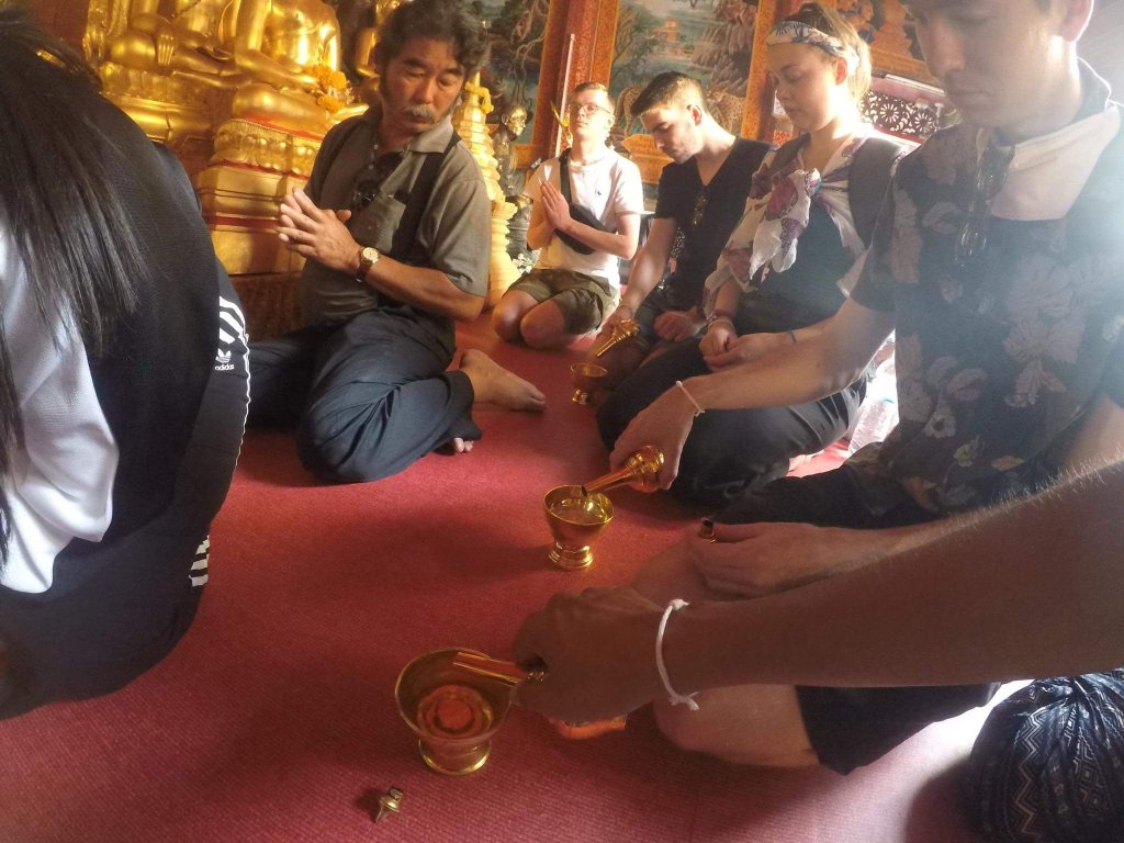 Day 4: Chiang Mai. After the overnight train, we headed into Chiang Mai and checked into our hotel. After a few hours of time to ourselves, we hopped into a Tuk Tuk and headed up the mountain to the temple of Doi Suthep. Whilst there, Boom arranged for the Head Monk of the temple to bless the group and us individually. We received a Holy Bracelet and were splashed with Holy Water. We were also given a cylinder containing sticks with numbers on. You have to shake the cylinder until a stick falls out, and the number on the stick will tell you your fortune. In the evening we walked through Chiang Mai walking street, which is a famous street market.